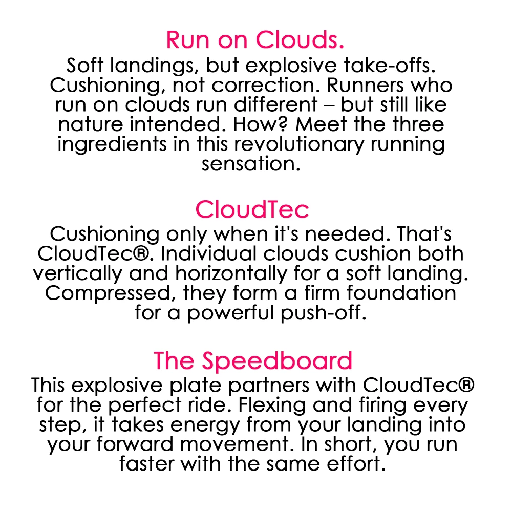 The Cloudventure Peak is designed for faster sessions or race day, with a very low weight and features a lower heel to forefoot drop of 4mm, better for those already nimble on their feet and landing on the forefoot.